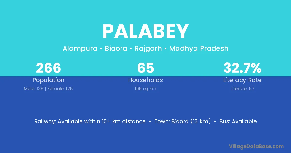 Biaora (13 km) is the nearest town to Palabey village for major economic activities and is located approximately 13 km away.