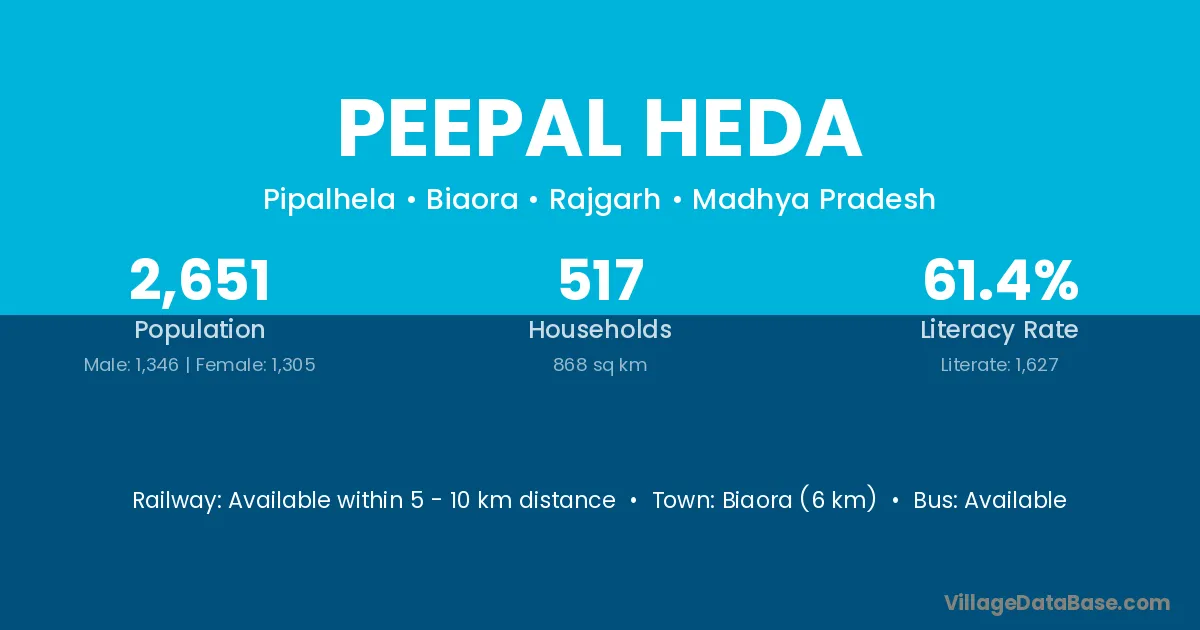 Biaora (6 km) is the nearest town to Peepal Heda village for major economic activities and is located approximately 6 km away.