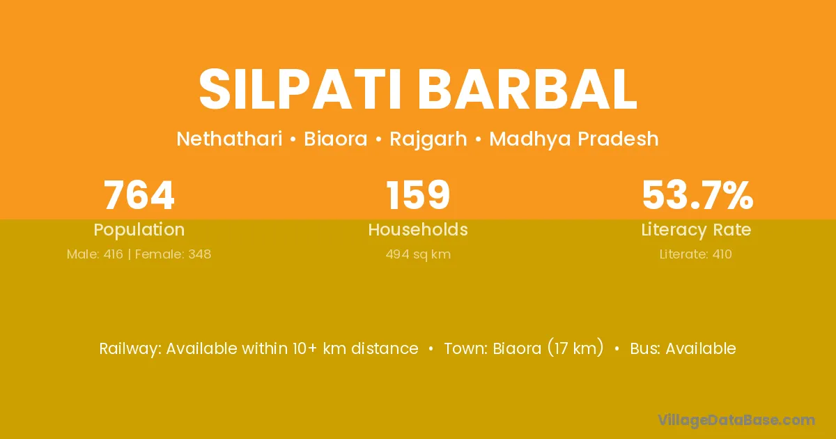 Biaora (17 km) is the nearest town to Silpati Barbal village for major economic activities and is located approximately 17 km away.