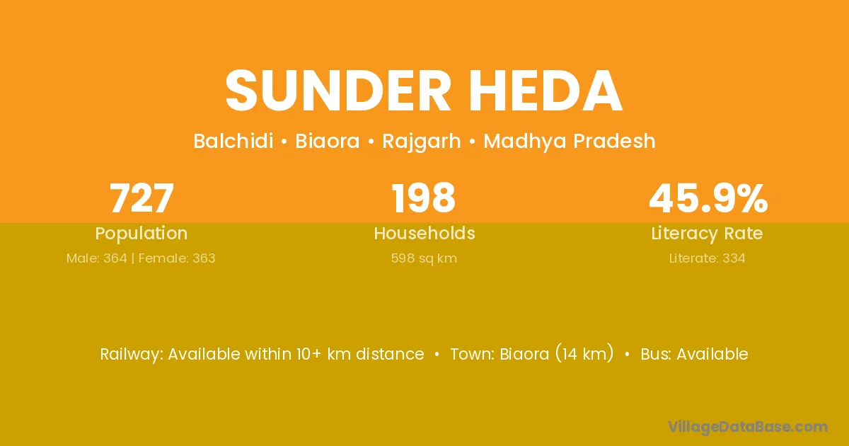 Biaora (14 km) is the nearest town to Sunder Heda village for major economic activities and is located approximately 14 km away.