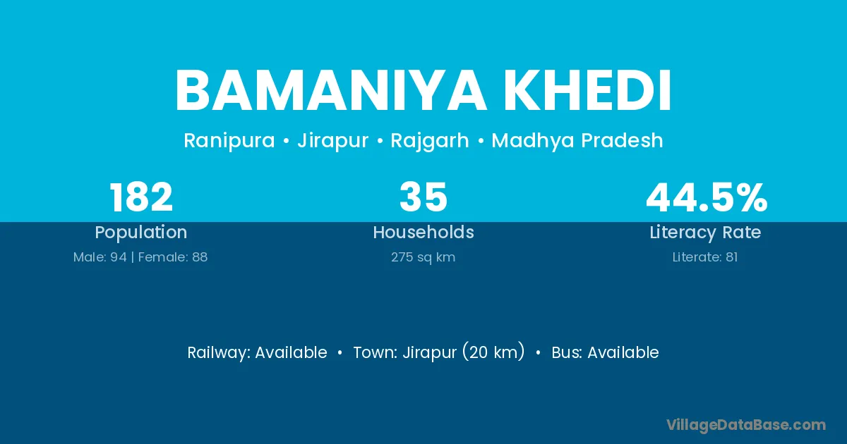 Bamaniya Khedi village has a total population of 182 people, of which 94 are males and 88 are females.