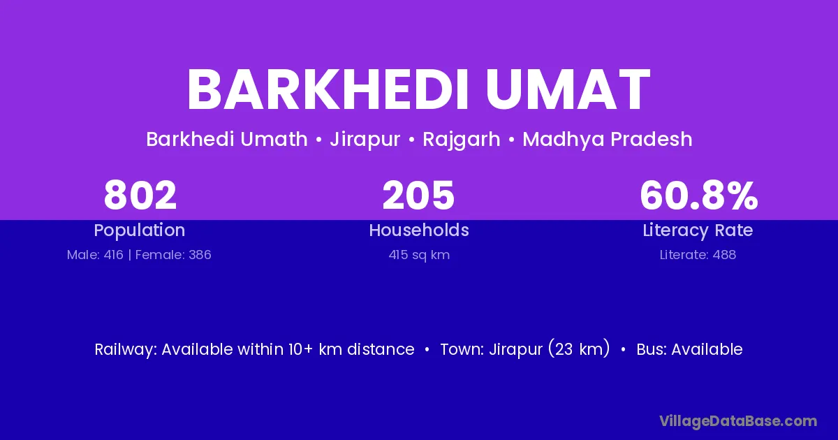 Barkhedi Umat village has a total population of 802 people, of which 416 are males and 386 are females.
