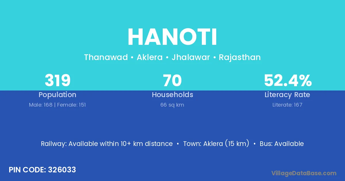 Jirapur (20 km) is the nearest town to Hanoti village for major economic activities and is located approximately 20 km away.