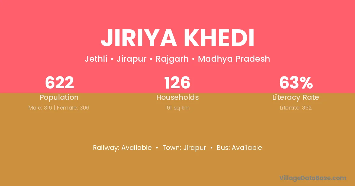 Jiriya Khedi village has a total population of 622 people, of which 316 are males and 306 are females.