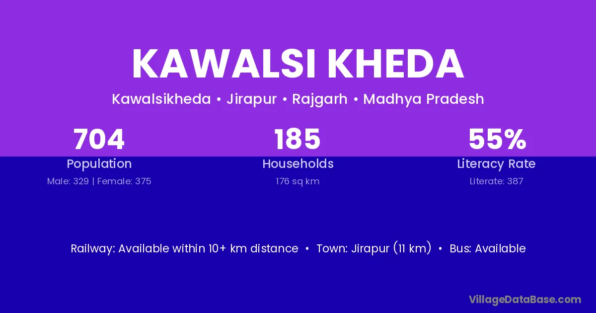Jirapur (11 km) is the nearest town to Kawalsi Kheda village for major economic activities and is located approximately 11 km away.