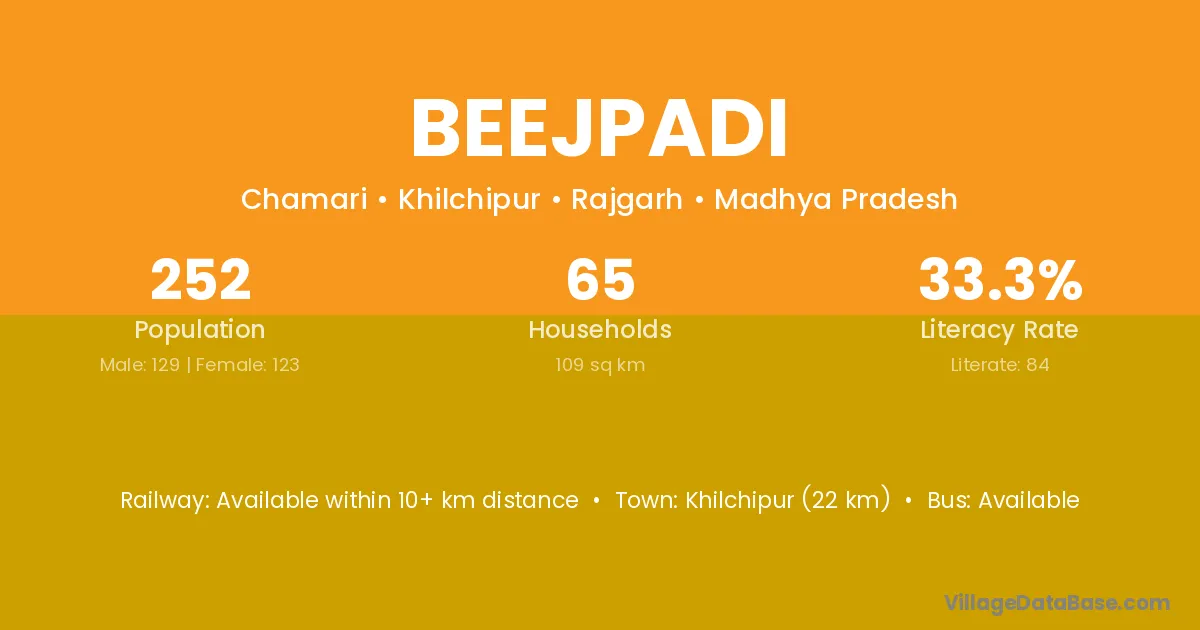 Khilchipur (22 km) is the nearest town to Beejpadi village for major economic activities and is located approximately 22 km away.