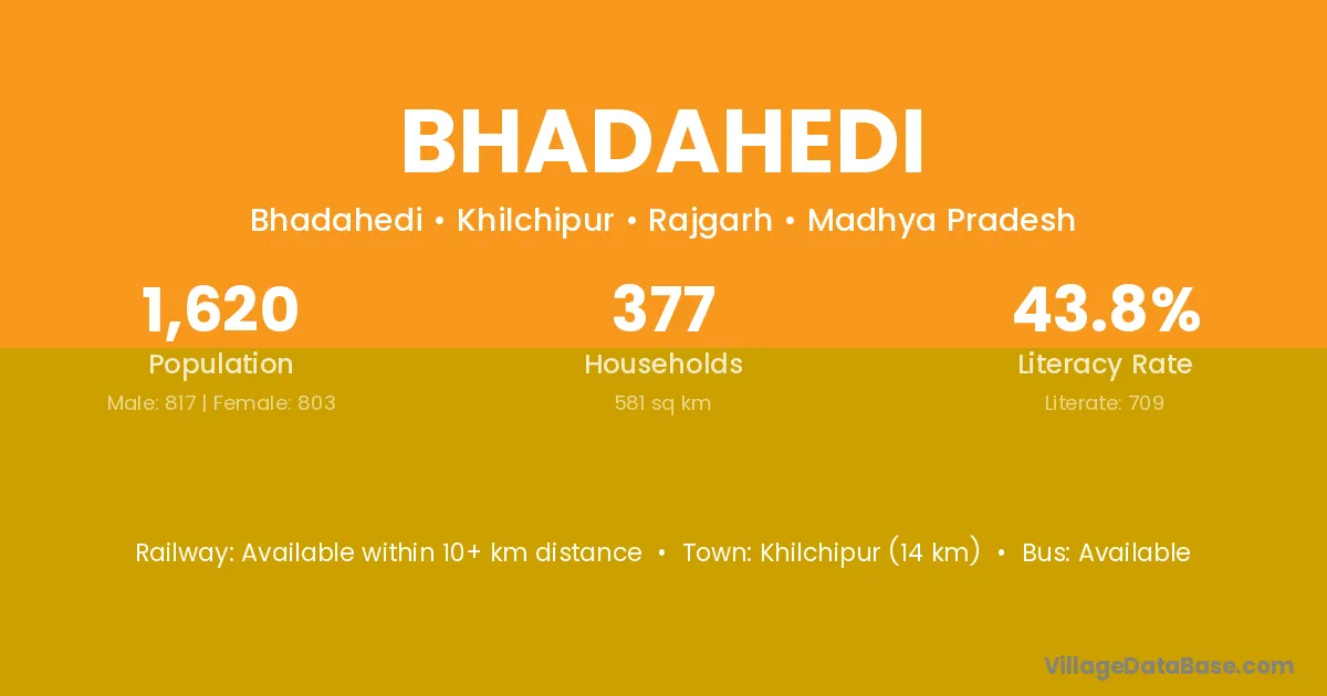 Khilchipur (14 km) is the nearest town to Bhadahedi village for major economic activities and is located approximately 14 km away.