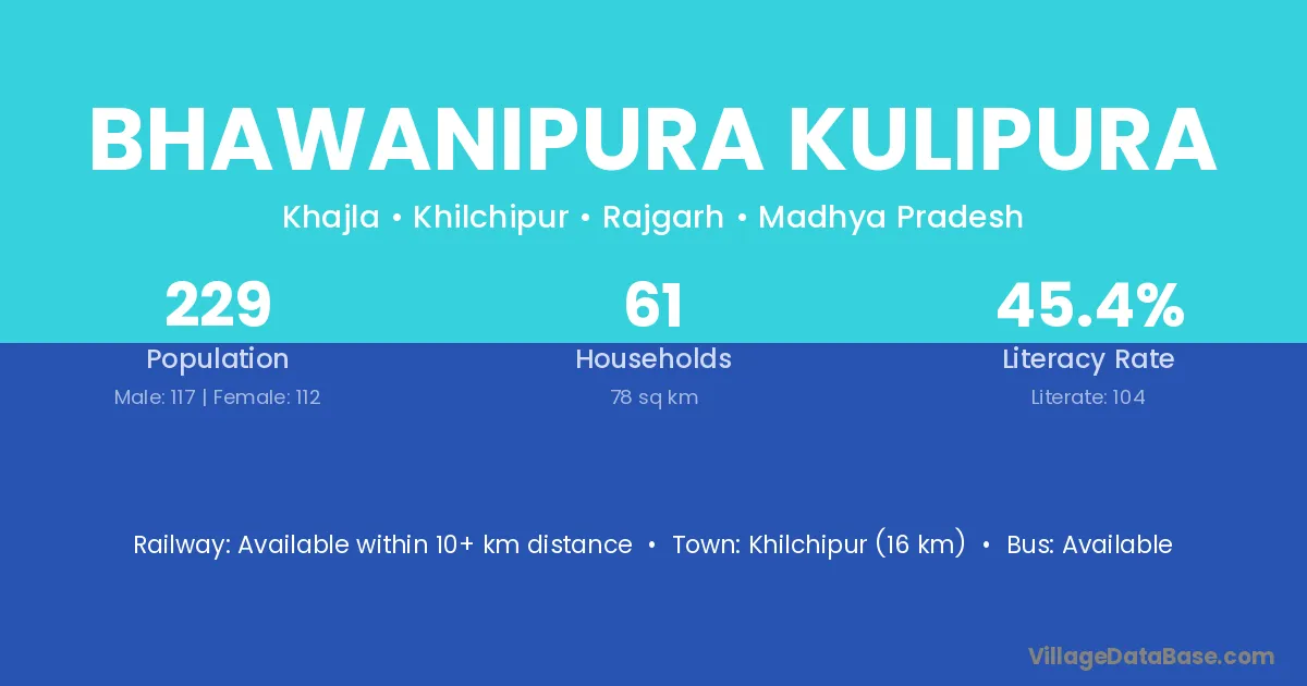 Khilchipur (16 km) is the nearest town to Bhawanipura Kulipura village for major economic activities and is located approximately 16 km away.