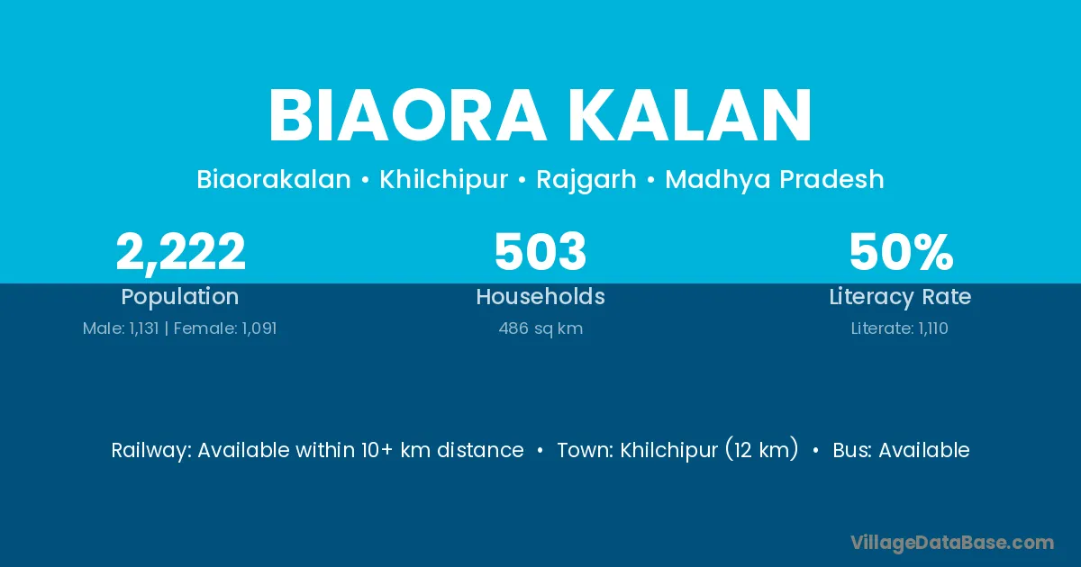 Biaora Kalan village has a total population of 2,222 people, of which 1,131 are males and 1,091 are females.
