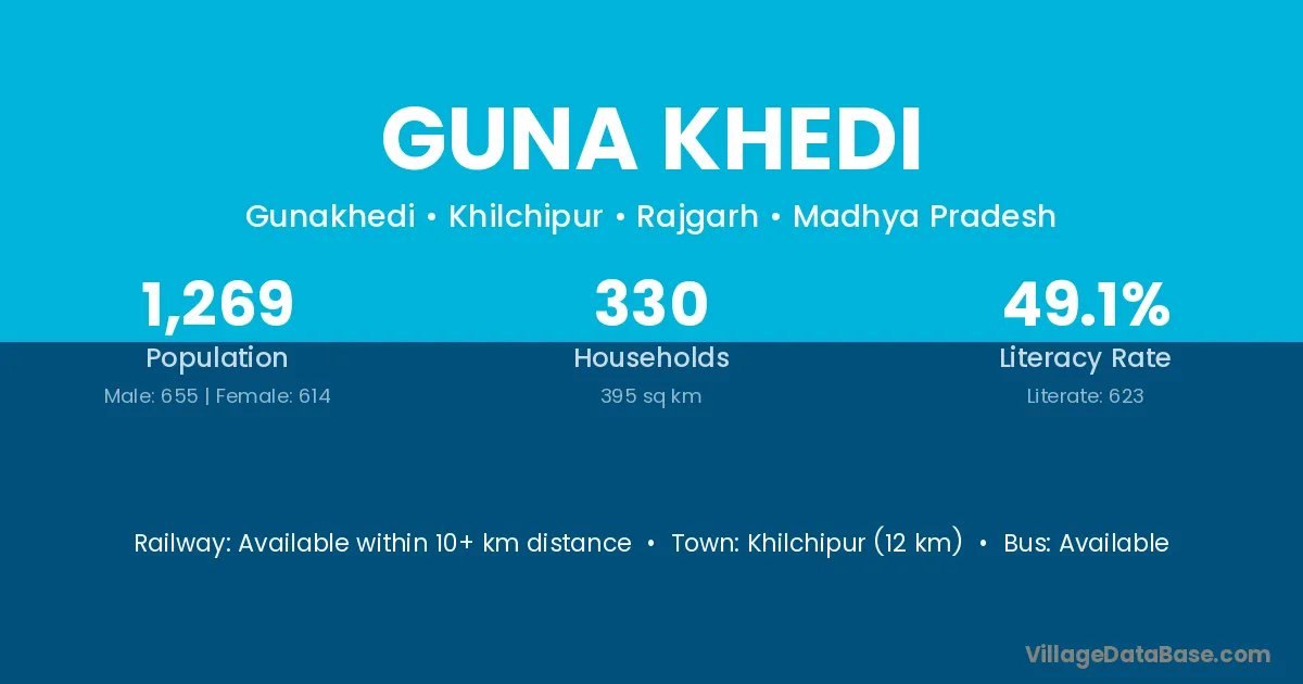Guna Khedi village has a total population of 1,269 people, of which 655 are males and 614 are females.