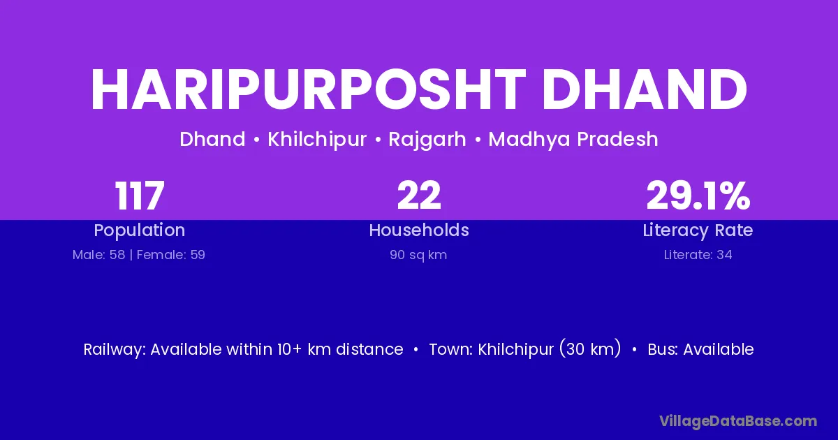 Khilchipur (30 km) is the nearest town to Haripurposht Dhand village for major economic activities and is located approximately 30 km away.