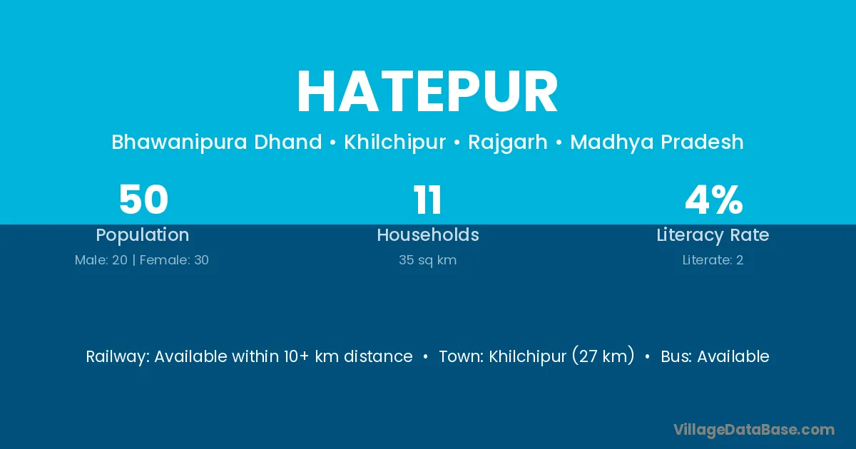 Khilchipur (27 km) is the nearest town to Hatepur village for major economic activities and is located approximately 27 km away.