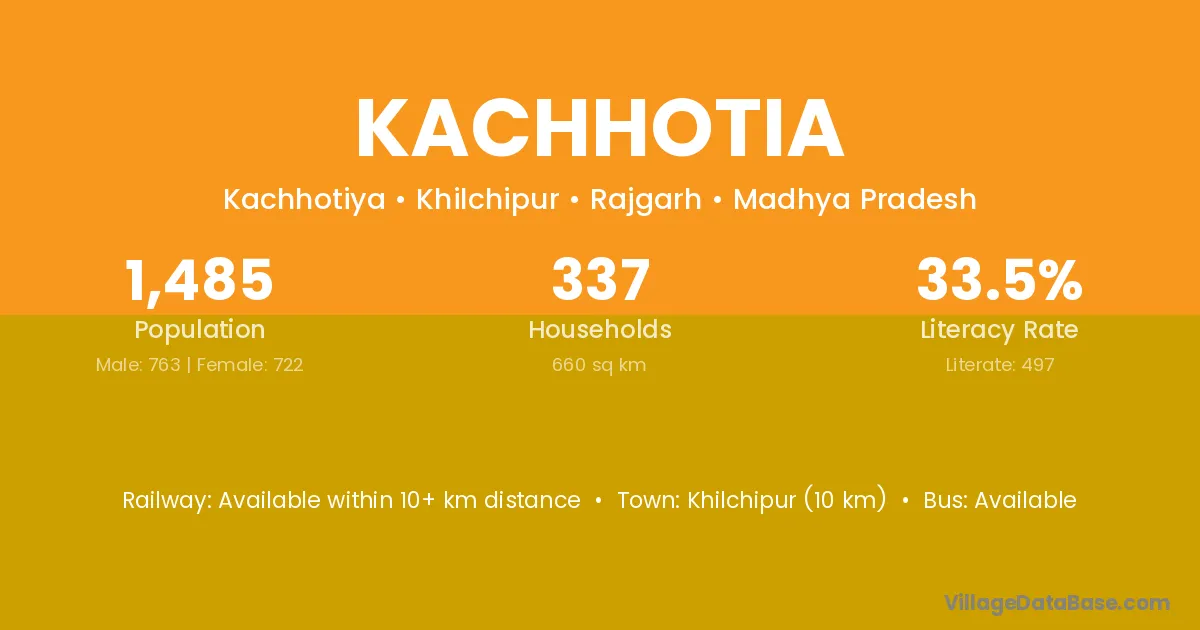 Khilchipur (10 km) is the nearest town to Kachhotia village for major economic activities and is located approximately 10 km away.
