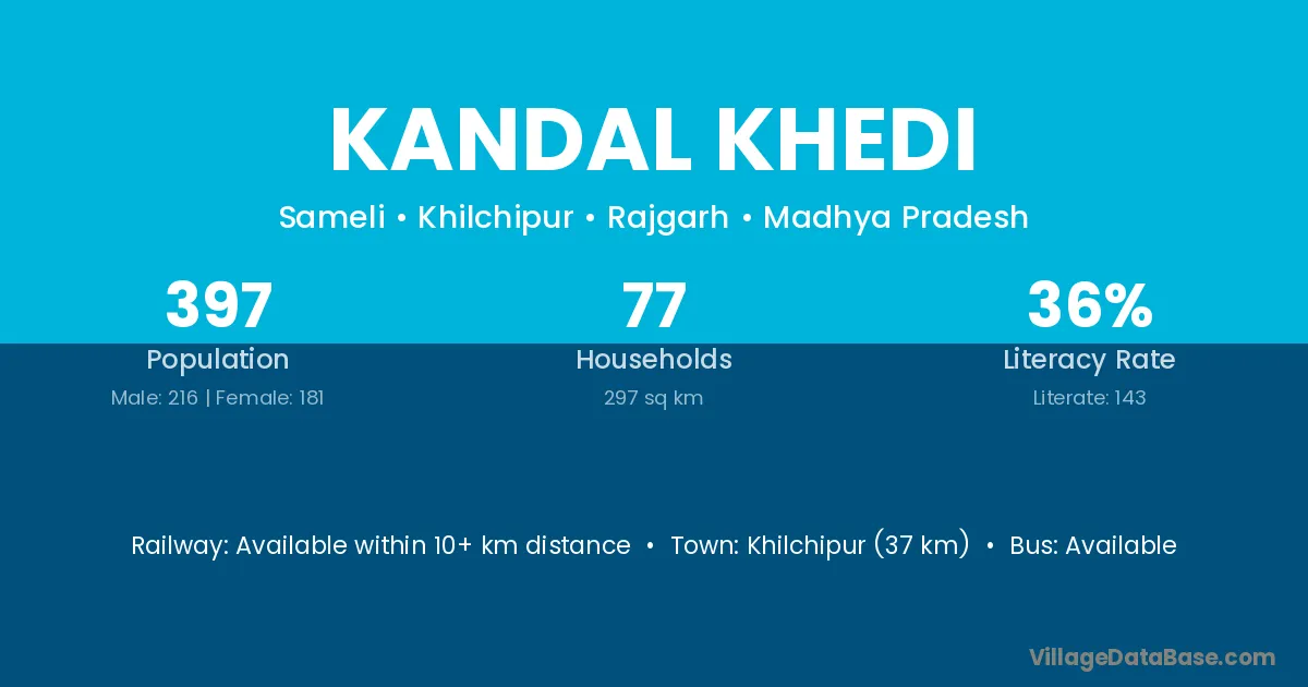 Khilchipur (37 km) is the nearest town to Kandal Khedi village for major economic activities and is located approximately 37 km away.