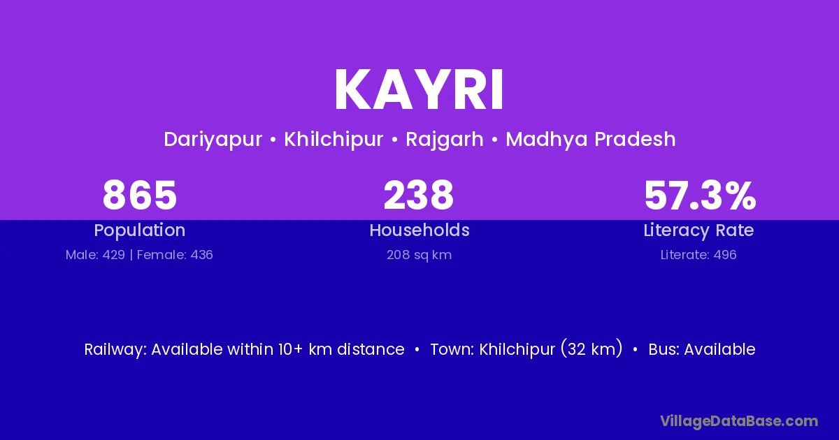 Khilchipur (32 km) is the nearest town to Kayri village for major economic activities and is located approximately 32 km away.