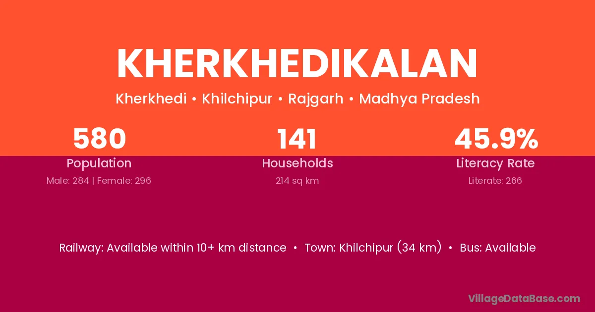 Kherkhedikalan village has a total population of 580 people, of which 284 are males and 296 are females.