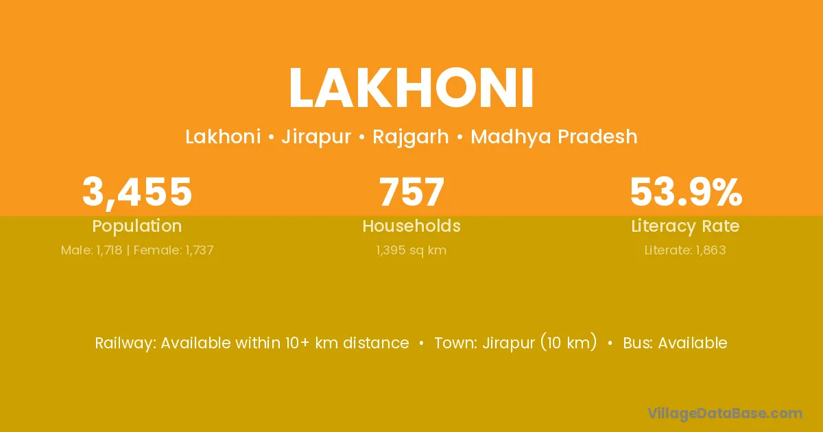 Khilchipur (21 km) is the nearest town to Lakhoni village for major economic activities and is located approximately 21 km away.