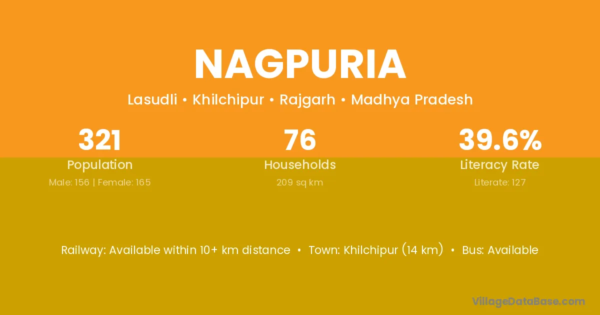 Khilchipur (14 km) is the nearest town to Nagpuria village for major economic activities and is located approximately 14 km away.