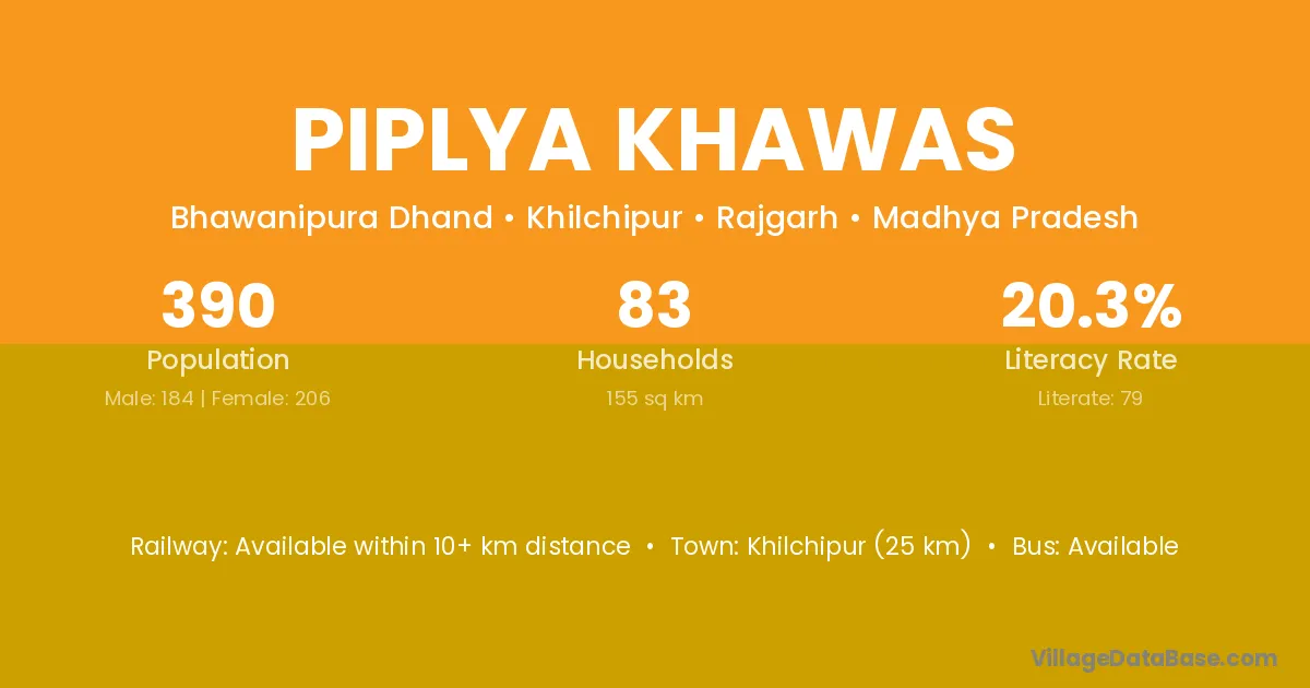 Khilchipur (25 km) is the nearest town to Piplya Khawas village for major economic activities and is located approximately 25 km away.