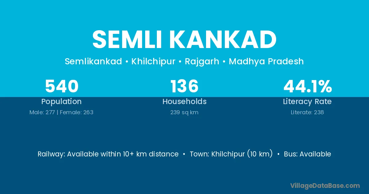 Khilchipur (10 km) is the nearest town to Semli Kankad village for major economic activities and is located approximately 10 km away.
