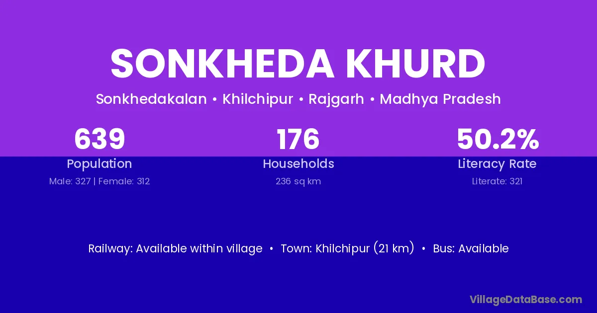 Khilchipur (21 km) is the nearest town to Sonkheda Khurd village for major economic activities and is located approximately 21 km away.