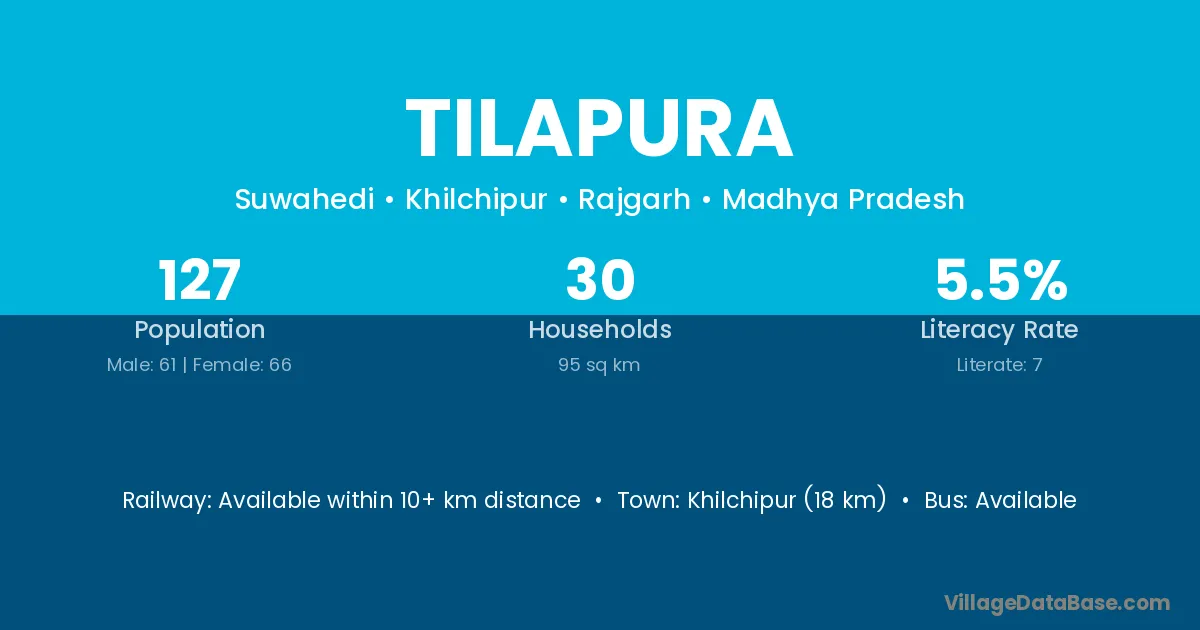 Khilchipur (18 km) is the nearest town to Tilapura village for major economic activities and is located approximately 18 km away.
