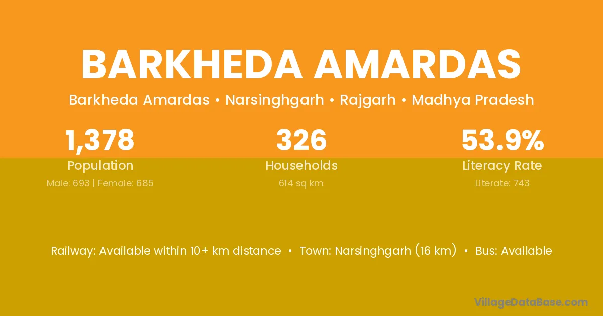 Barkheda Amardas village has a total population of 1,378 people, of which 693 are males and 685 are females.