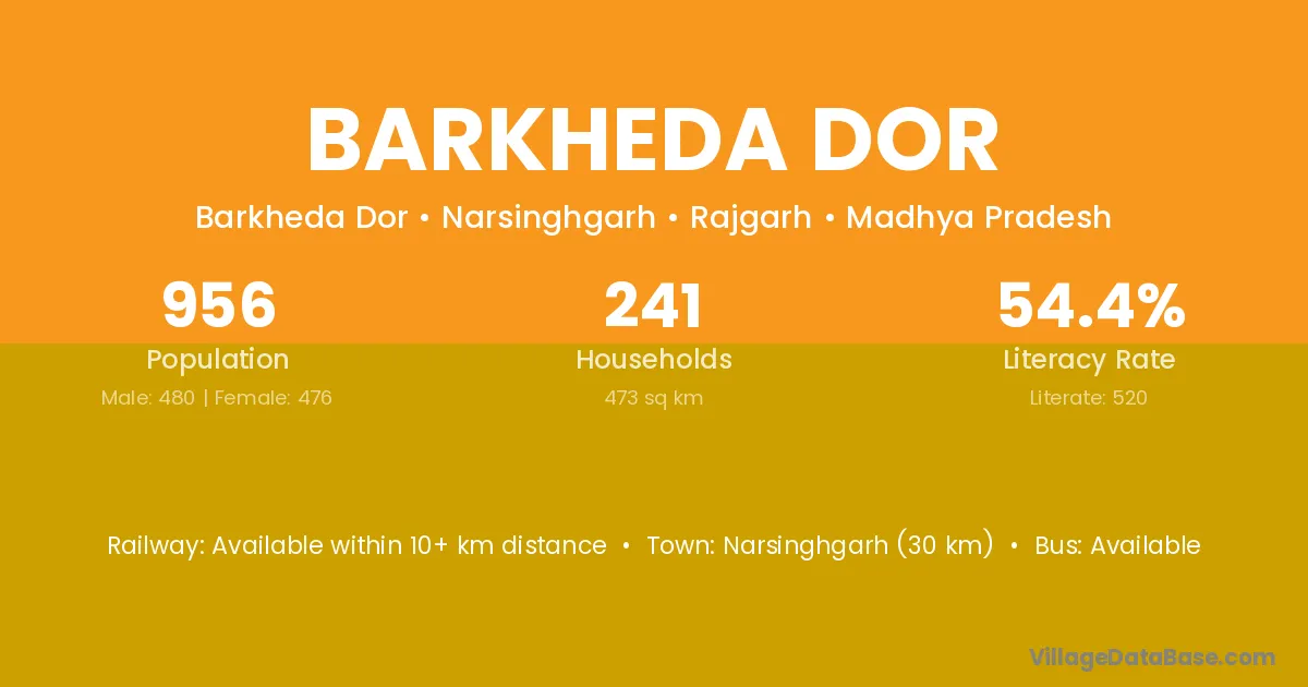 Barkheda Dor village has a total population of 956 people, of which 480 are males and 476 are females.