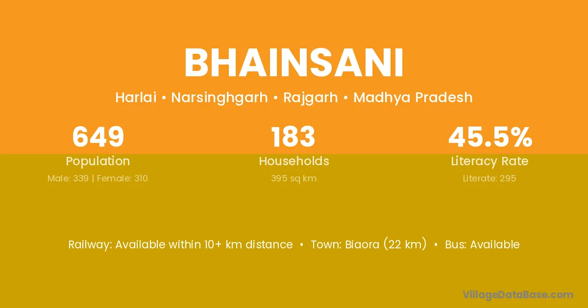 Biaora (22 km) is the nearest town to Bhainsani village for major economic activities and is located approximately 22 km away.