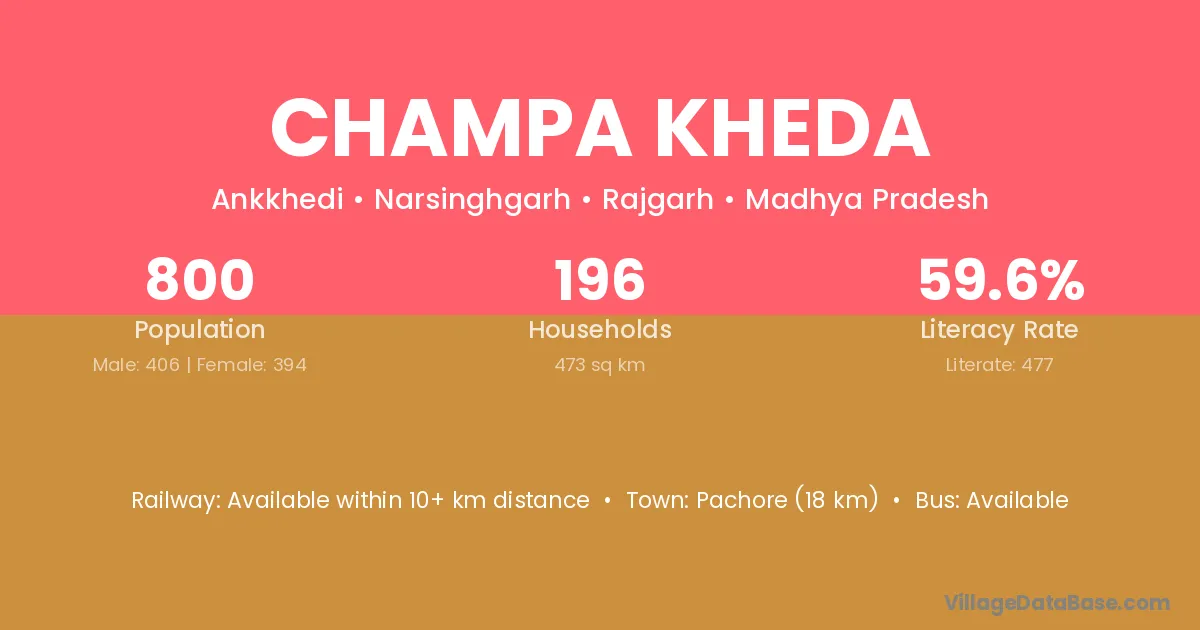 Pachore (18 km) is the nearest town to Champa Kheda village for major economic activities and is located approximately 18 km away.