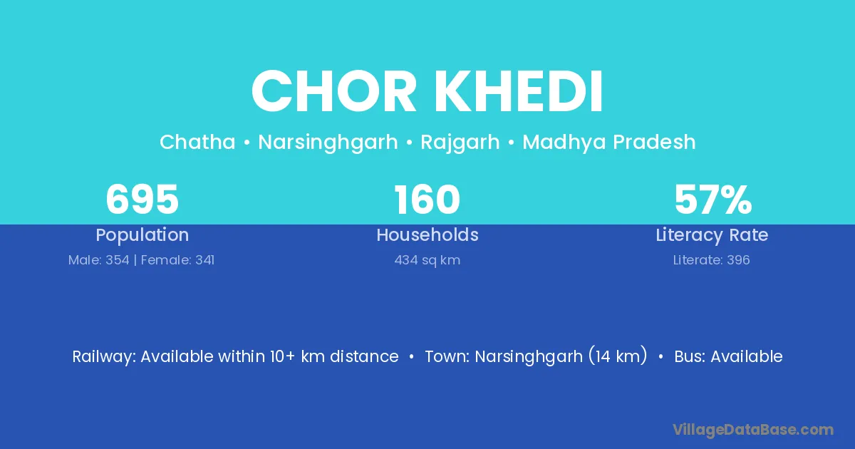 Narsinghgarh (14 km) is the nearest town to Chor Khedi village for major economic activities and is located approximately 14 km away.