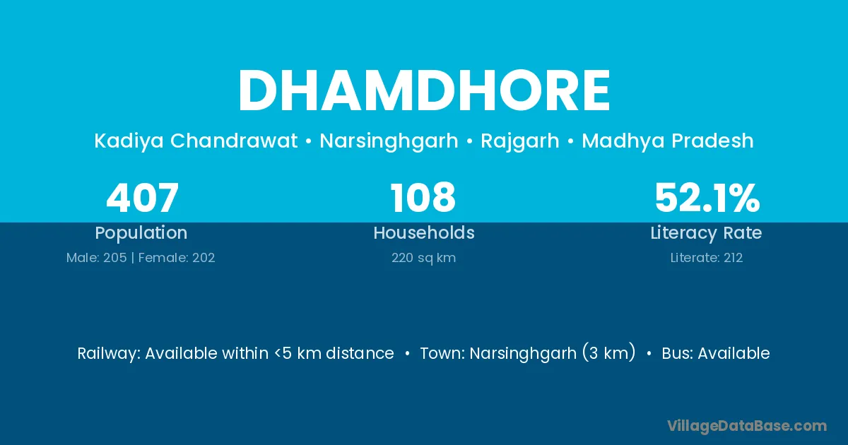 Narsinghgarh (3 km) is the nearest town to Dhamdhore village for major economic activities and is located approximately 3 km away.