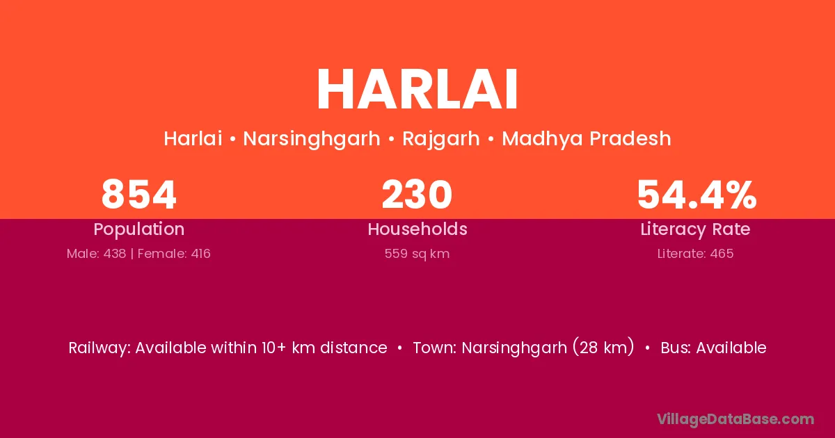 Narsinghgarh (28 km) is the nearest town to Harlai village for major economic activities and is located approximately 28 km away.