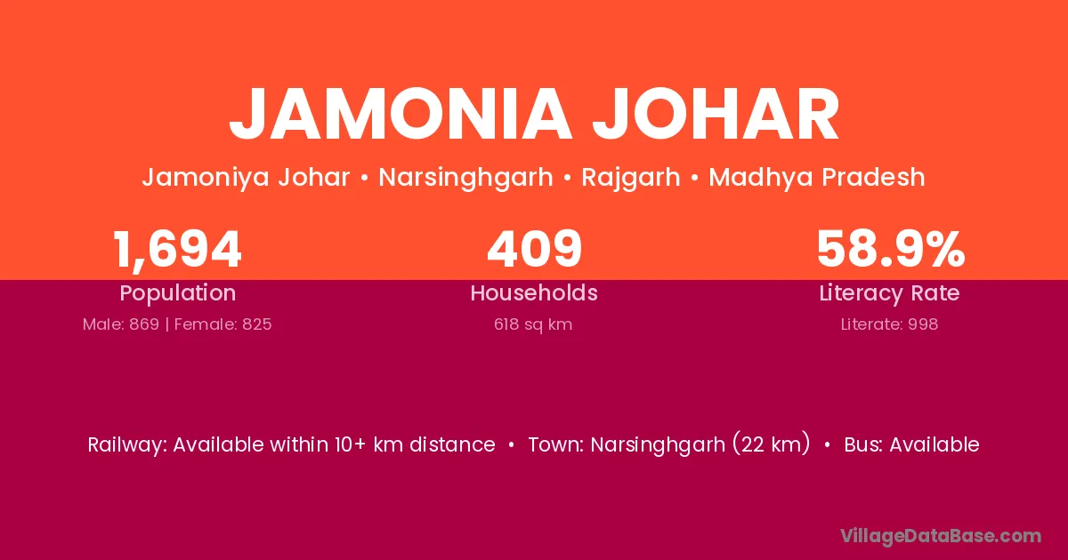 Narsinghgarh (22 km) is the nearest town to Jamonia Johar village for major economic activities and is located approximately 22 km away.