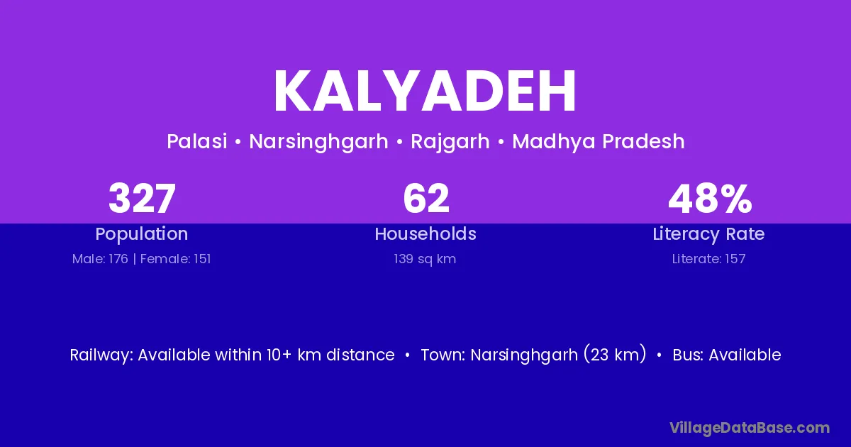 Narsinghgarh (23 km) is the nearest town to Kalyadeh village for major economic activities and is located approximately 23 km away.