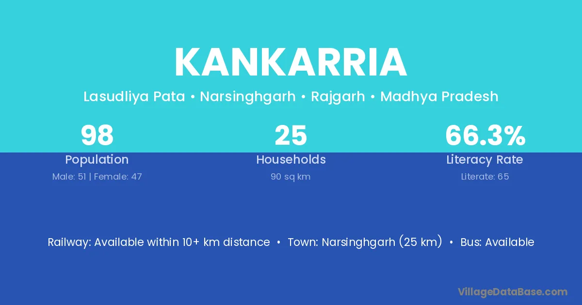 Narsinghgarh (25 km) is the nearest town to Kankarria village for major economic activities and is located approximately 25 km away.