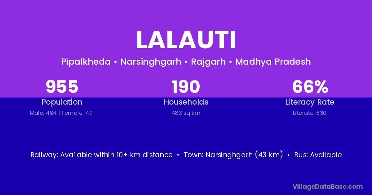 Narsinghgarh (43 km) is the nearest town to Lalauti village for major economic activities and is located approximately 43 km away.