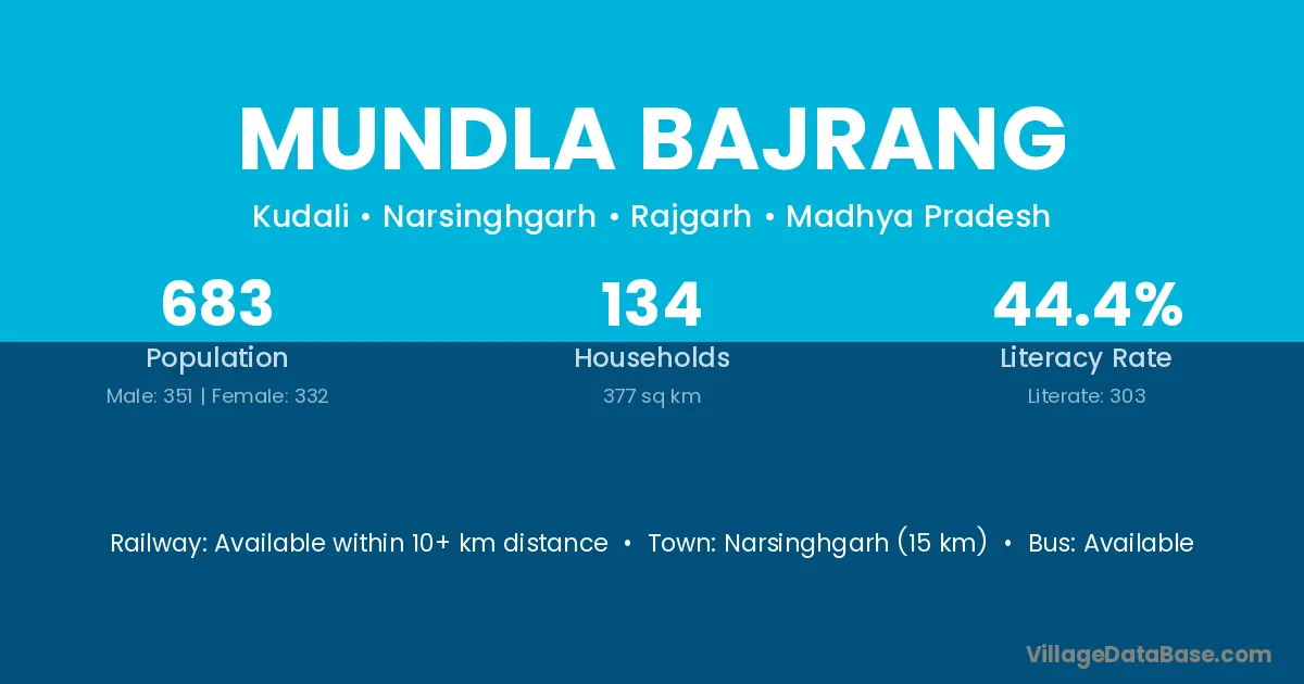 Narsinghgarh (15 km) is the nearest town to Mundla Bajrang village for major economic activities and is located approximately 15 km away.