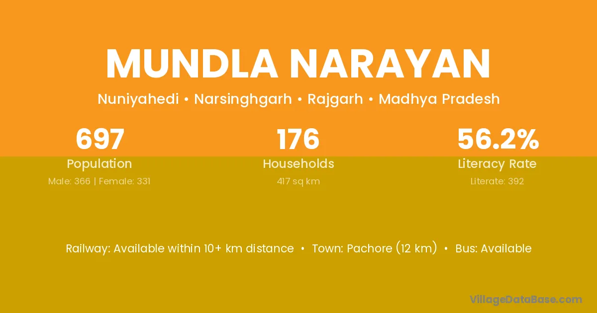 Pachore (12 km) is the nearest town to Mundla Narayan village for major economic activities and is located approximately 12 km away.