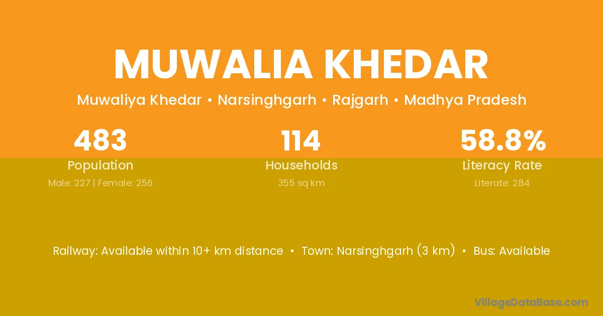 Narsinghgarh (3 km) is the nearest town to Muwalia Khedar village for major economic activities and is located approximately 3 km away.
