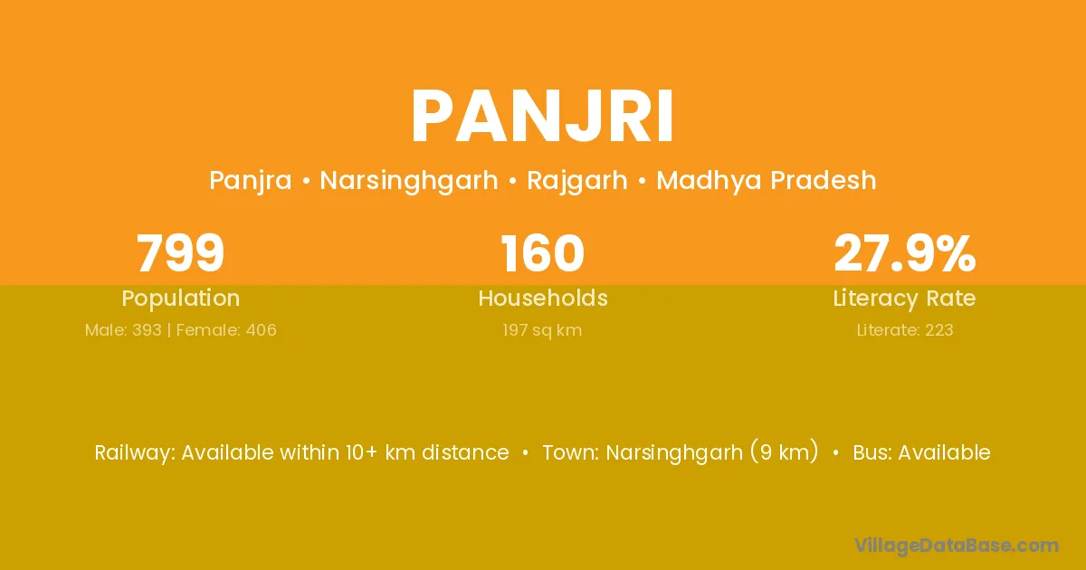 Narsinghgarh (9 km) is the nearest town to Panjri village for major economic activities and is located approximately 9 km away.