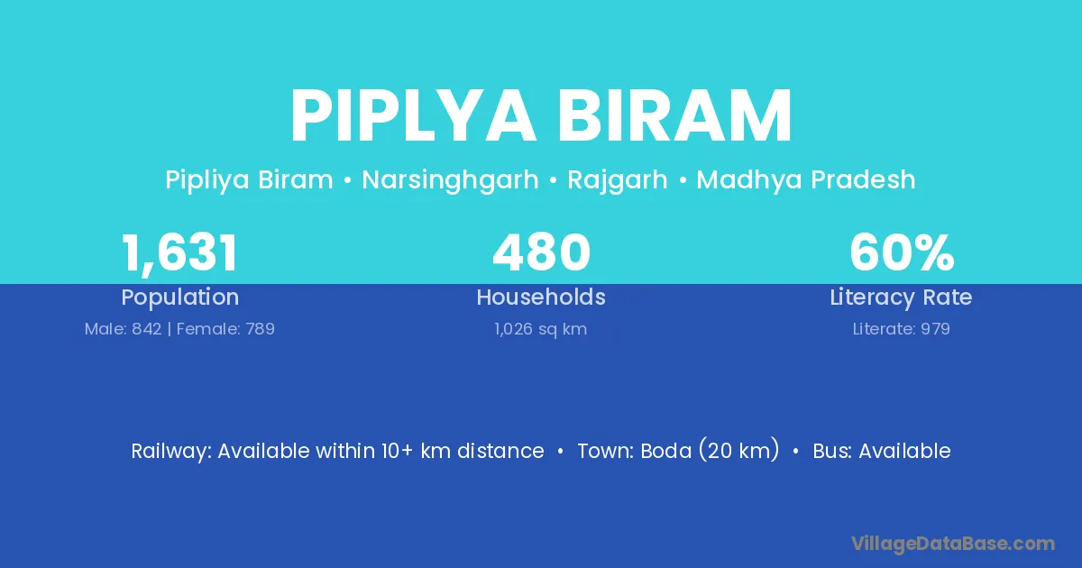 Boda (20 km) is the nearest town to Piplya Biram village for major economic activities and is located approximately 20 km away.