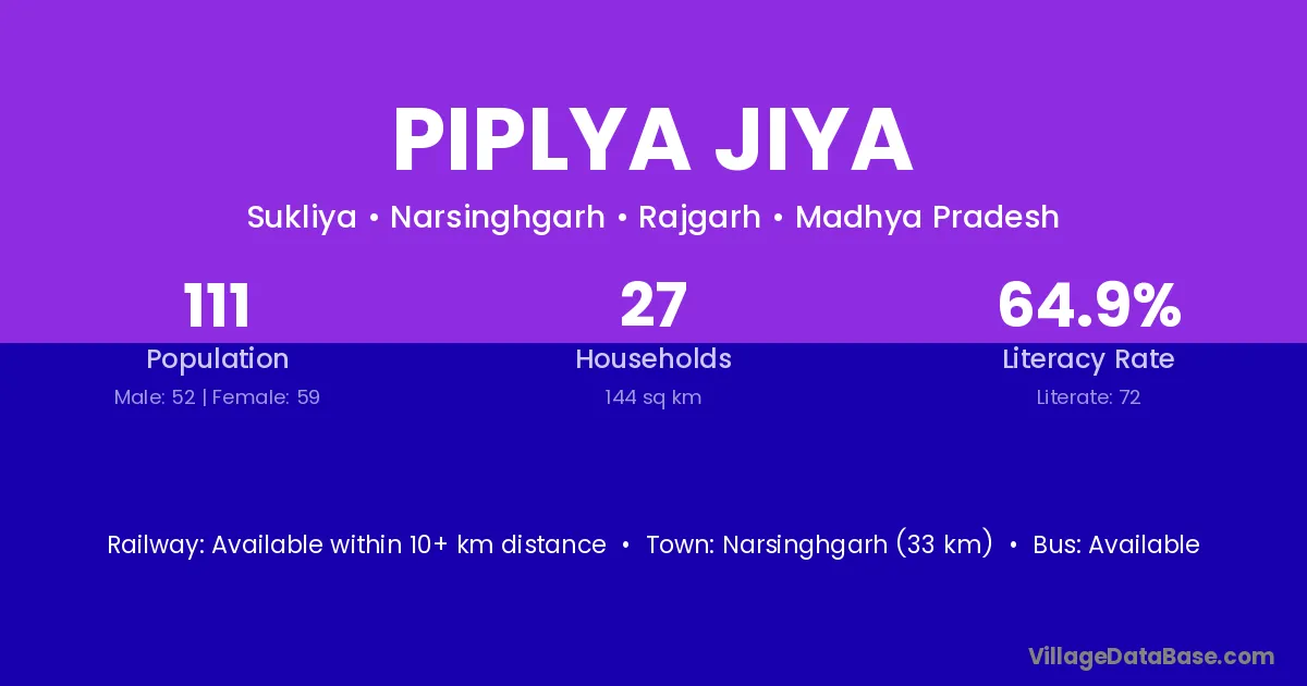 Piplya Jiya village has a total population of 111 people, of which 52 are males and 59 are females.