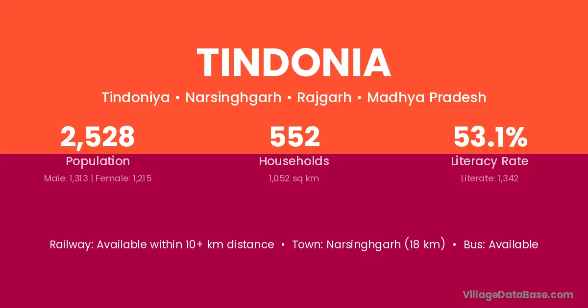 Narsinghgarh (18 km) is the nearest town to Tindonia village for major economic activities and is located approximately 18 km away.