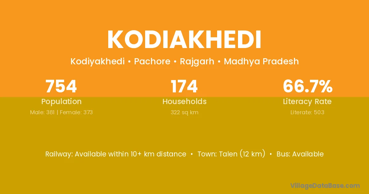 Talen (12 km) is the nearest town to Kodiakhedi village for major economic activities and is located approximately 12 km away.