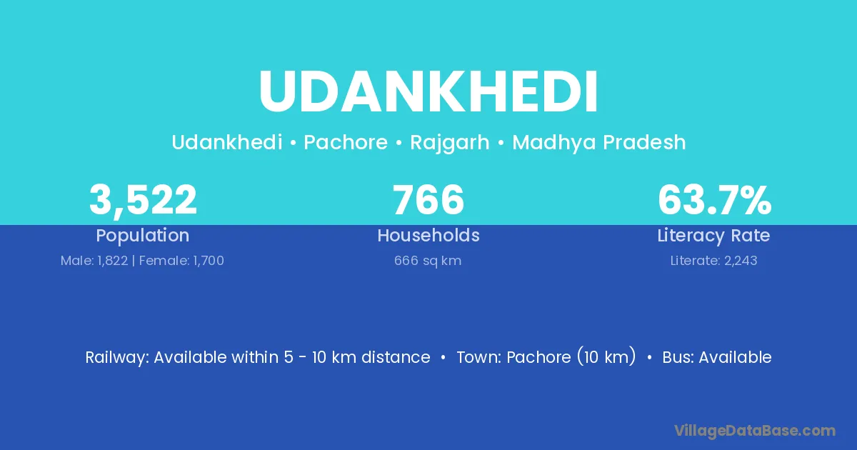 Pachore (10 km) is the nearest town to Udankhedi village for major economic activities and is located approximately 10 km away.