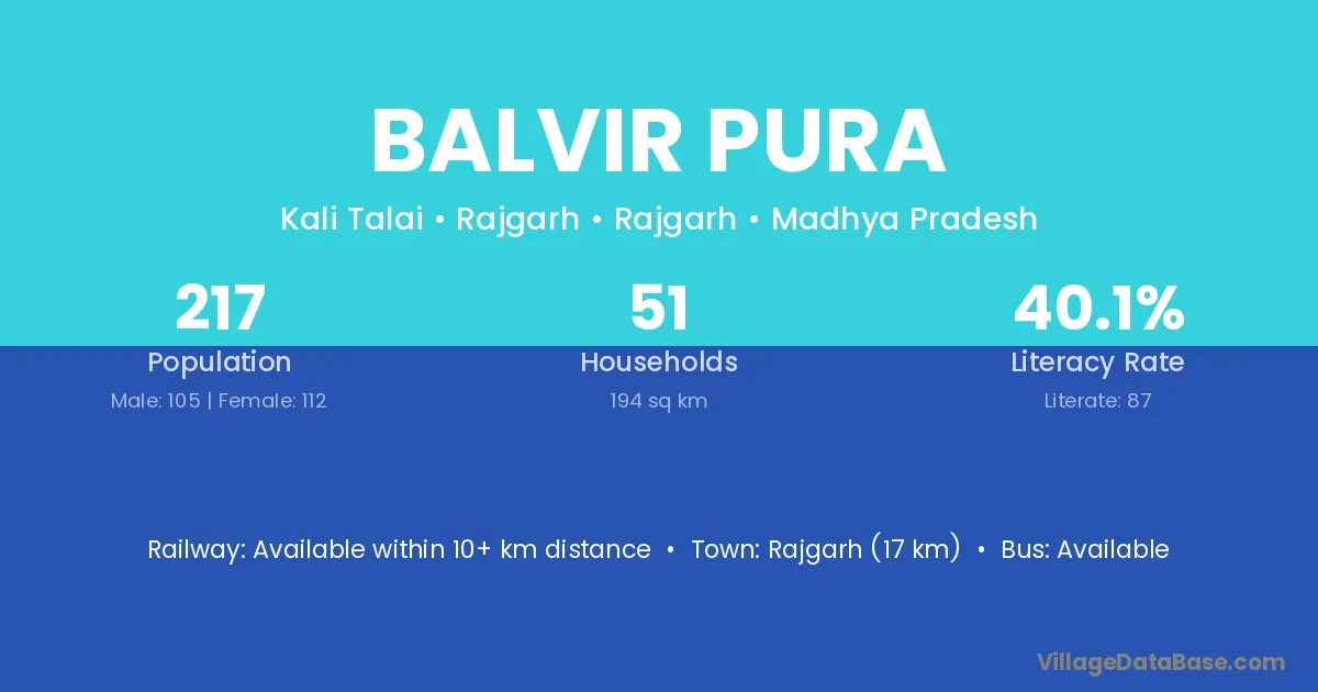 Rajgarh (17 km) is the nearest town to Balvir Pura village for major economic activities and is located approximately 17 km away.
