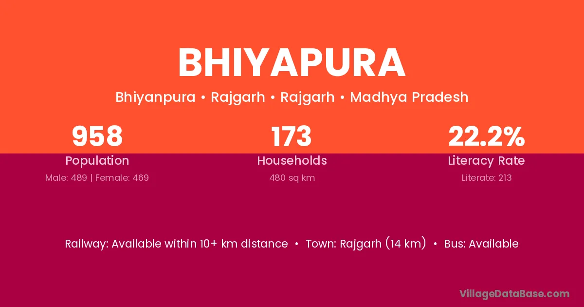 Bhiyapura village has a total population of 958 people, of which 489 are males and 469 are females.