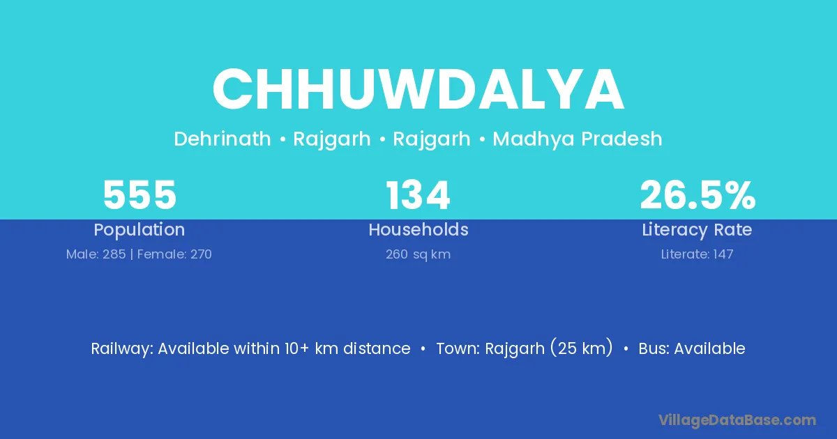 Rajgarh (25 km) is the nearest town to Chhuwdalya village for major economic activities and is located approximately 25 km away.