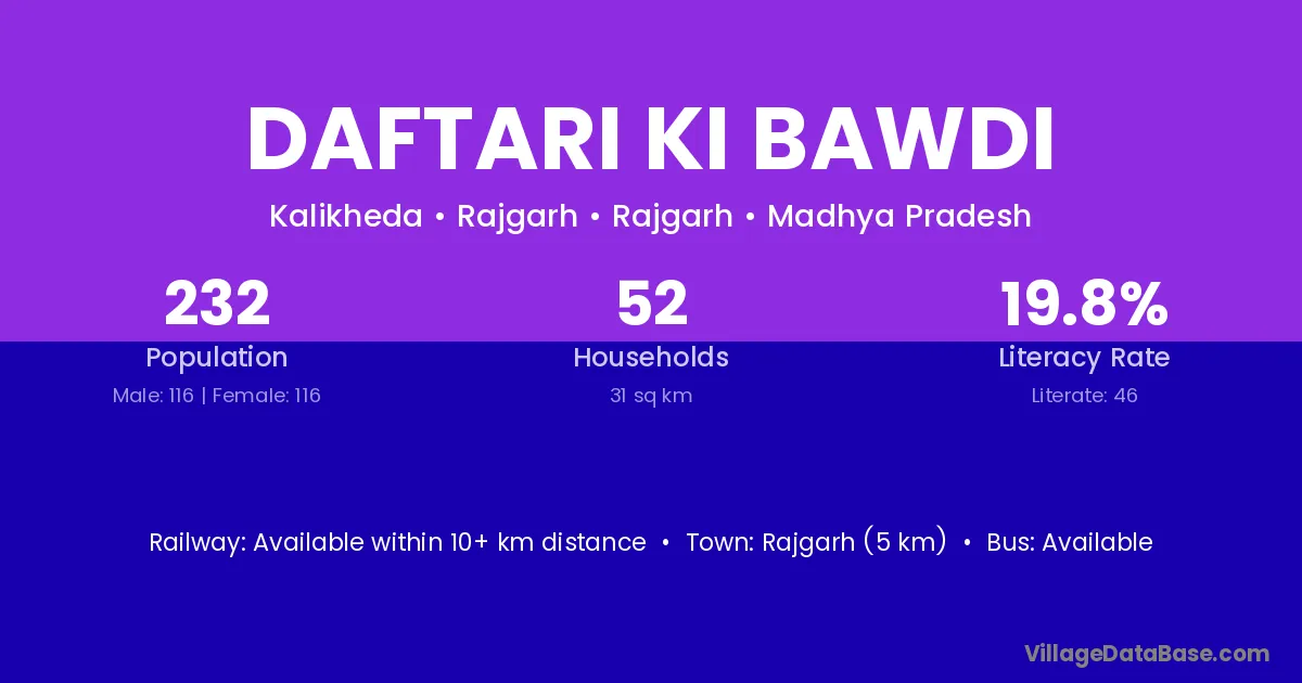 Daftari Ki Bawdi village has a total population of 232 people, of which 116 are males and 116 are females.